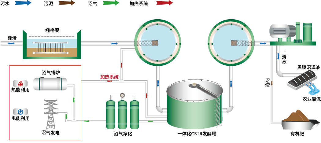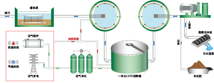 我公司開發出一整套解決方案,對生活、工業、農牧業日常產生的各類有機廢棄物進行全面收 集、循環利用和科學環保處理。利用無需對原料分類的混合原料發酵技術和沼氣發電余熱保溫的免維 護超大厭氧反應器,有效提高產氣率和投資利用率,在沼氣項目中實現可持續盈利的商業化運營模式。