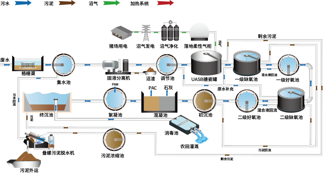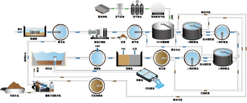 養殖行業糞污處理整體工程以生化處理技術(UASB+兩級AO+除磷+終沉)為核心工藝,確保COD、氨氮、總磷的穩定達標。對養殖場動物糞進行無害化與資源化處理,利用環境生物技術,混合專用發酵菌,對動物糞進行高溫好氧發酵,實現快速腐熟與除臭,使其生物轉化為優質堆肥。