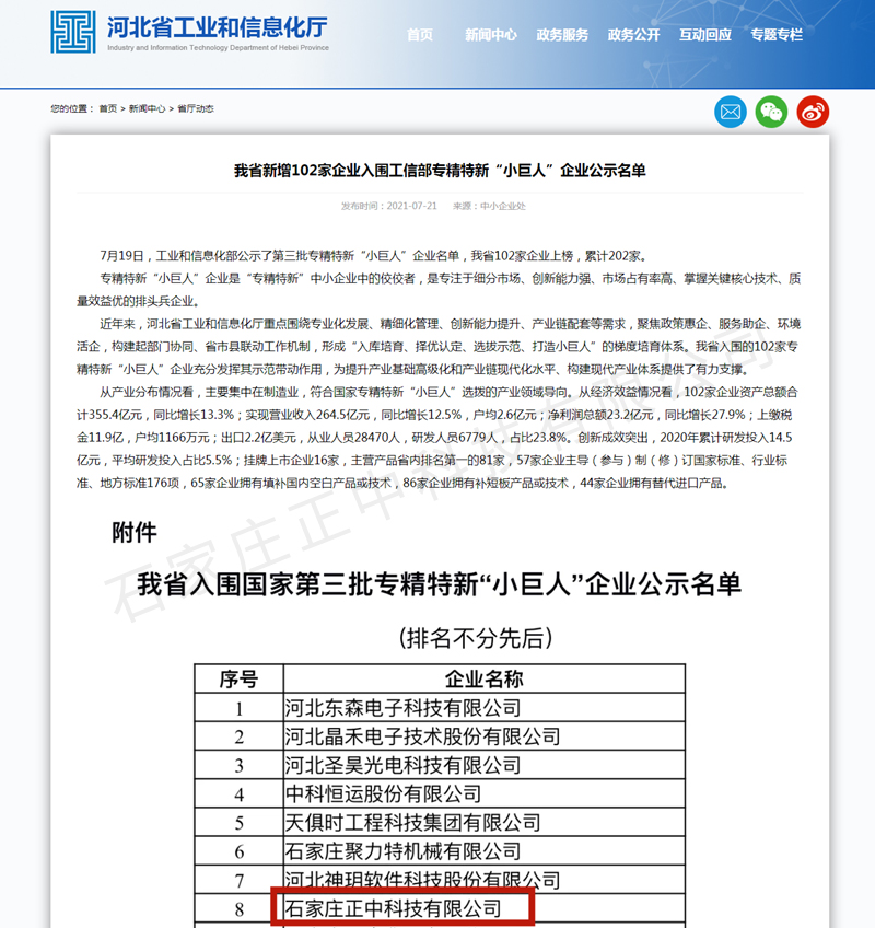 日前,工業和信息化部公示了第三批專精特新“小巨人”企業名單。專精特新“小巨人”企業是“專精特新”中小企業中的佼佼者,是專注于細分市場、創新能力強、市場占有率高、掌握關鍵核心技術、質量效益優的排頭兵企業。經過重重選拔,石家莊正中科技有限公司在眾多優秀企業中脫穎而出,榜上有名,彰顯其在技術創新、企業綜合實力和高質量發展等方面得到了高度的肯定。
